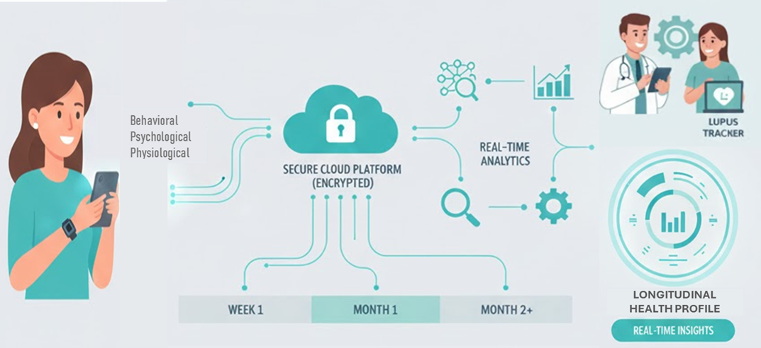 Lupus nephritis (LN) and other rheumatic diseases are characterized by fluctuating disease activity, requiring prompt changes in therapy. Interestingly, patient-reported outcomes (PROs) are highly effective for monitoring disease by capturing patients’ personal experiences with symptoms, functioning, and quality of life. However, current patient-reported outcome (PRO) measures are typically collected only during clinic visits, and are subjective. This project aims to develop and validate a digital phenotyping platform that enables continuous, remote monitoring of behavioral, physiological, and psychological parameters relevant to rheumatic disease activity and quality of life.